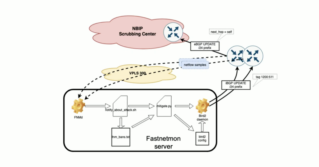• How AMS-IX designed a fully automated mitigation pipeline, combining FastNetMon detection, Python/BERT/BGP orchestration, and NAVAS scrubbing.