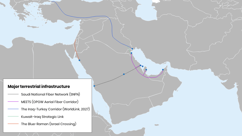 - The Kuwait–Iraq Strategic Link: This is a critical short-haul gateway that connects the internal Gulf networks to the Iraq-Turkey transit route. In early 2026, this link was significantly hardened to serve as the switch that allows data coming from the UAE or Qatar to jump off the Gulf's subsea systems and onto the safer Iraqi land corridor. It is the essential physical hand-off point that makes the entire "North Route" viable.