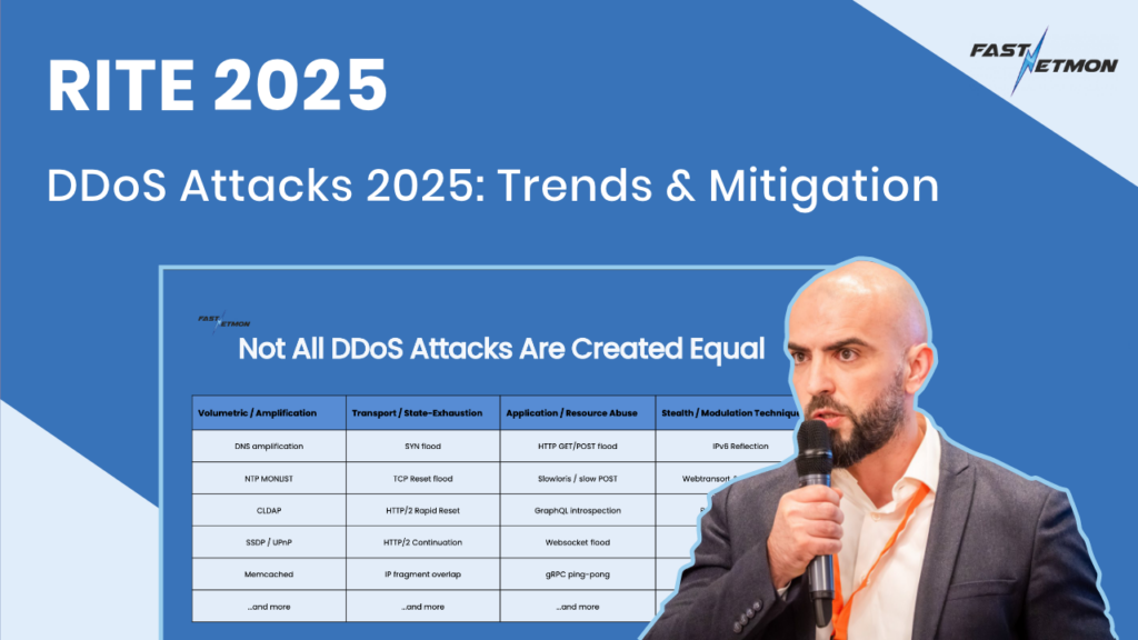 Explore FastNetMon’s comprehensive collection of conference presentations from various events, network operator conferences, and meetups over the years. This page provides access to presentation slides, links to full presentations on our YouTube channel, and insightful event recap blogposts. It serves as a valuable resource for those interested in technical presentations and industry talks in the realm of DDoS and Network Security.